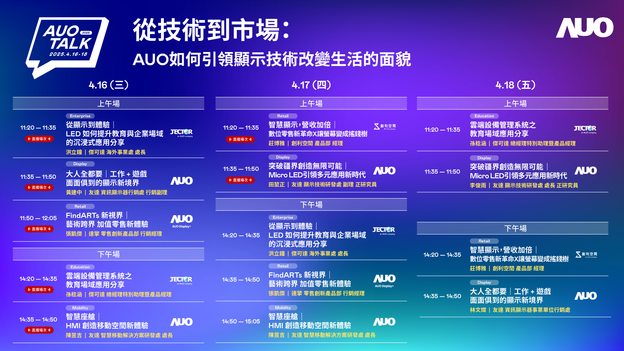 友達持續深化拓展垂直場域,並延伸建構價值鏈,打造共創、共榮的智慧場域生態圈。Touch Taiwan 2025展覽期間,友達展區將舉辦2025 AUO Talk,匯集旗下子公司華麗陣容,針對7大主題及相關成功案例進行專題演講,分享突破疆界創造無限可能|Micro LED引領多元應用新時代、FindARTs新視界|藝術跨界.永續體驗,以及智慧顯示、營收加倍|數位零售新革命X讓螢幕變成搖錢樹等豐富內容,為展覽訪客演譯友達賦能智慧場域新生態,引領顯示技術改變生活的嶄新面貌。