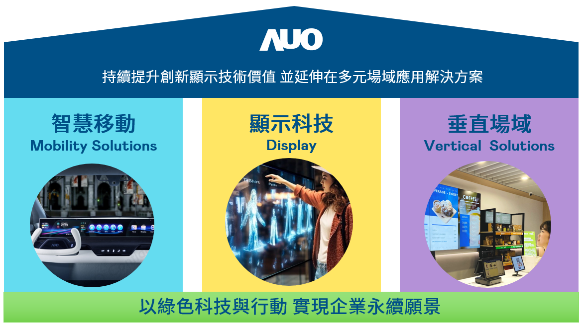 我們持續推動「雙軸轉型」,在精進顯示技術附加價值(Go Premium),與深化垂直市場應用(Go Vertical)的策略下,對應友達的優勢競爭力與趨勢,我們奠定顯示技術、智慧移動、垂直場域三大永續營運支柱,在顯示技術領域的根基之上,延伸布局多元場域應用解決方案。將先進顯示科技助力智慧移動及垂直場域發展,並以綠色科技與行動為實踐,在轉型之路上貫徹永續經營之願景。